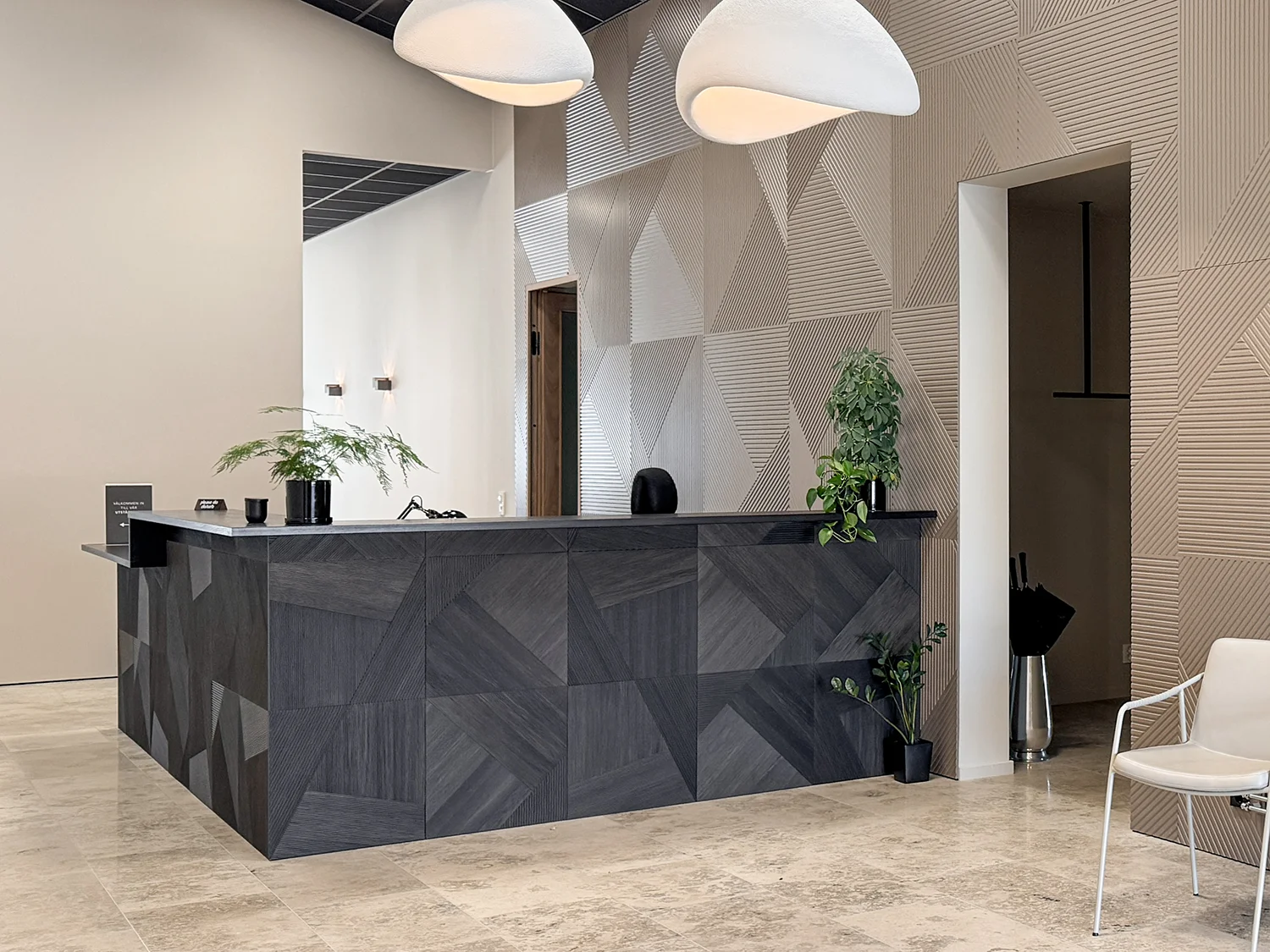 När man kommer in möts man av en 5,5m sluttande takhöjd med assymetriska lampskärmar, sandfärgad fossilerad kalksten och en receptionsdisk med återbrukad svartek från Wonderwall Studios. Det assymetriska mönstret från receptionsdiskens svartek återkommer i väggpanelens mönster som bygger en fondvägg bakom.