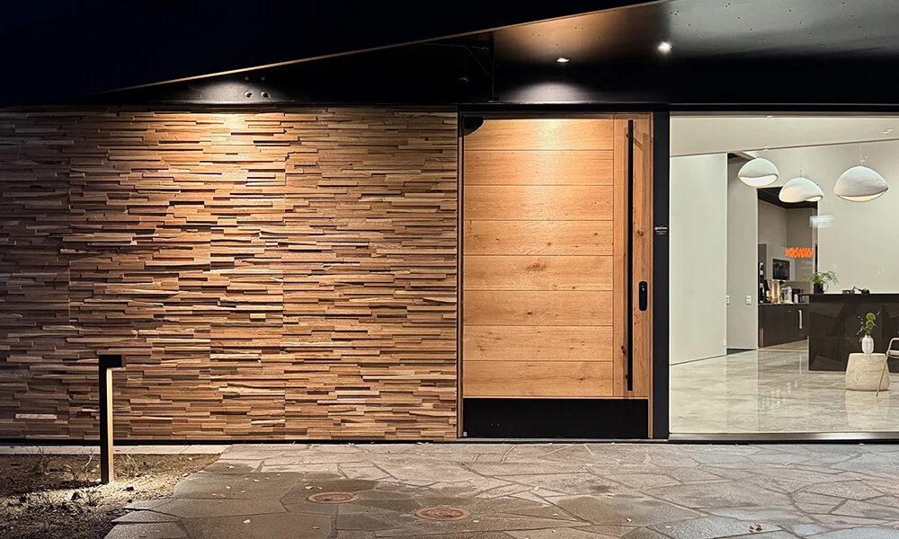 Väggbeklädnaden runt entrén är återbrukat spill av ek från vår egen fabrik som är uppsatt i sitt råa utförande, behandlade med olja 429 natur ljus. Entrédörren är en specialdesignad modell i Ek Rustikal med liggande och stående paneler. Den är behandlad med olja 429 natur ljus och utrustad med automatisk sensoröppning samt svarta detaljer i sparkplåt och draghandtag.