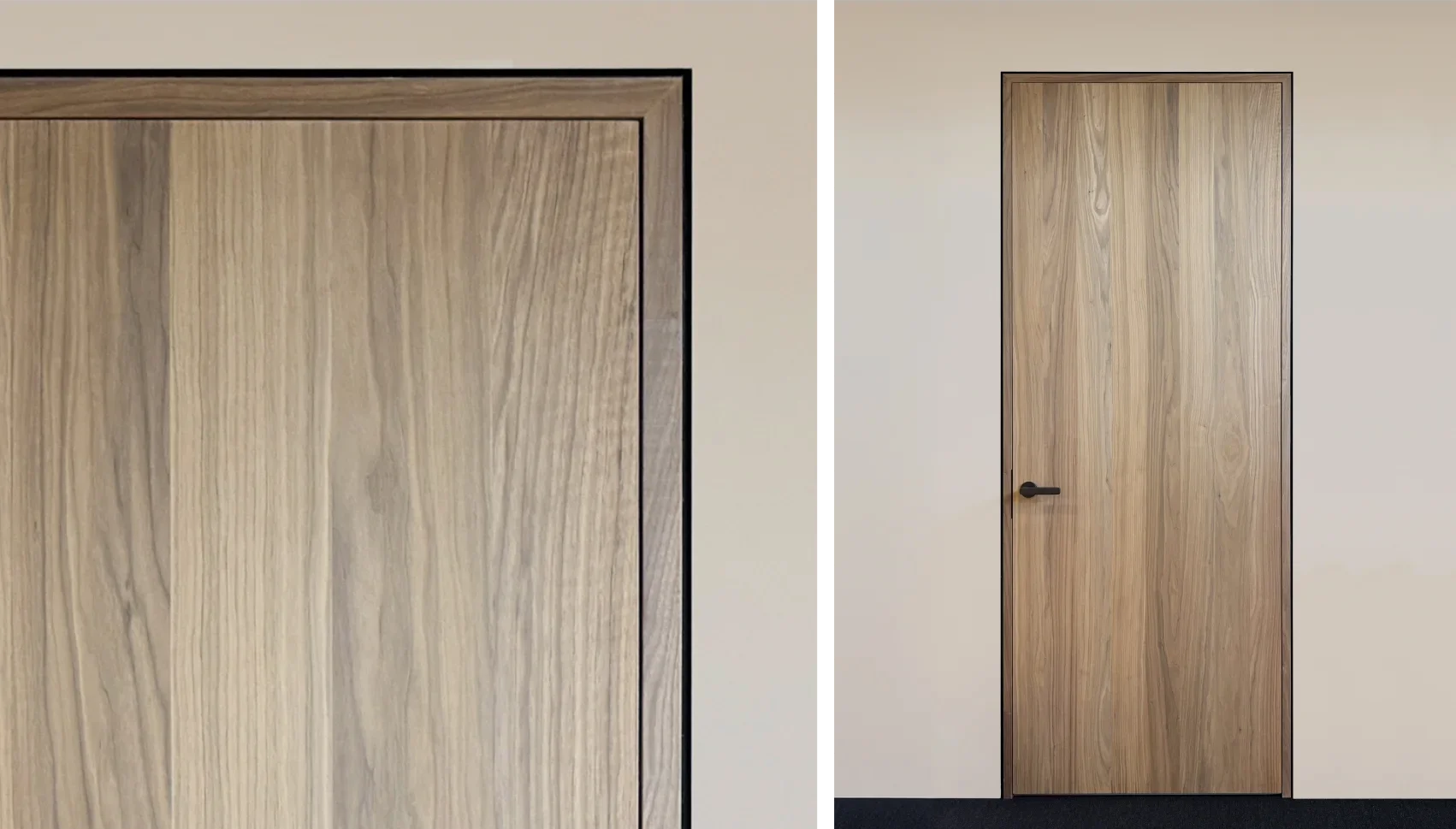Innerdörrarna i bygget är i Valnöt plus M25 höjd, behandlade med vår mattlack 433. Valnöten blir då lite gråare och ser nästan obehandlad ut. De flesta är utan nyckelskylt förutom WC dörrarna och alla har dolda gångjärn. Handtagen är Hoppes Dallas i minirosett, kulör svart F9714 samt FSBs 1267 i kulör 0710 aluminium blästrad matt mörk brons.